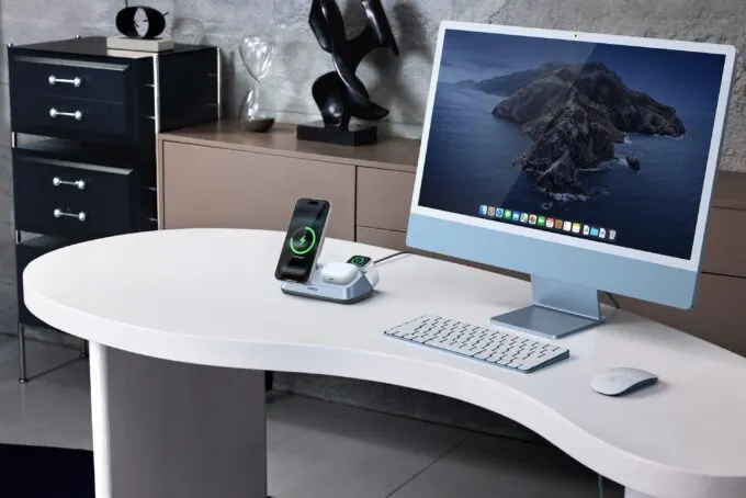 Еще одна зарядная станция для смартфонов и аксессуаров, но в более стационарном форм-факторе — хороший вариант для рабочего стола. Тут две зарядные площадки, причем основная получила шарнир, который позволяет разместить заряжаемый iPhone под удобным углом. На нее подается мощность до 25 Вт — это предел стандарта Qi2 25W. Вторая площадка имеет небольшое углубление — ее придумали для зарядки футляра от AirPods и прочей мелкой техники. Здесь мощность ограничена 5 Вт.