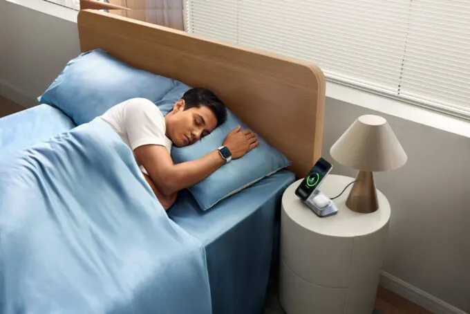 По сути, это аксессуар-двойник, который подключается к сети и подает энергию на две площадки беспроводной зарядки. На нем можно разместить, например, iPhone и кейс наушников AirPods. Верхняя площадка подвижна: ее можно установить под определенным углом — чтобы смотреть видео в процессе зарядки или спать рядом с iPhone, выполняющим функцию прикроватных часов.