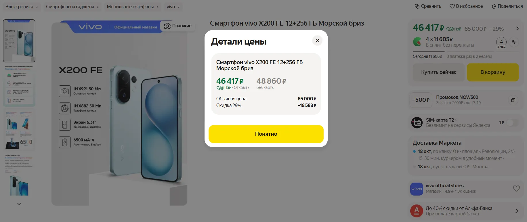 А что по цене? Все гуд: за Vivo X200 FE просят всего 48 860 рублей на Маркете. Компактных конкурентов нет, поэтому можно смело брать этот «виво». Отметим, что прайс персональный и зависит от продвинутости аккаунта, а также населенного пункта. Обязательно войдите в профиль перед оформлением заказа и проверьте, можно ли оформить доставку в ваш регион.