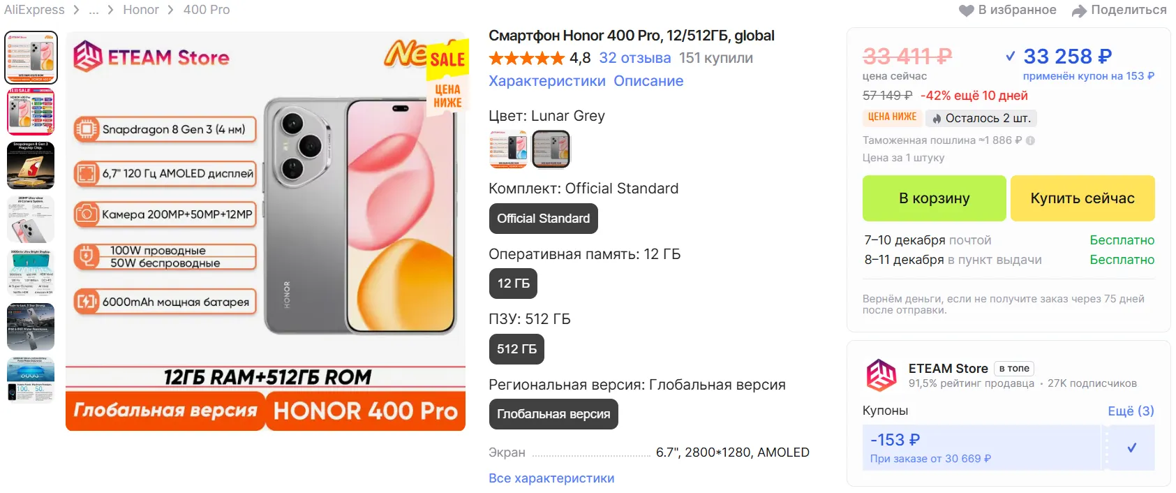 Цена: от 33 260 рублей с учетом купона продавца (пошлина — 2 260 рублей).