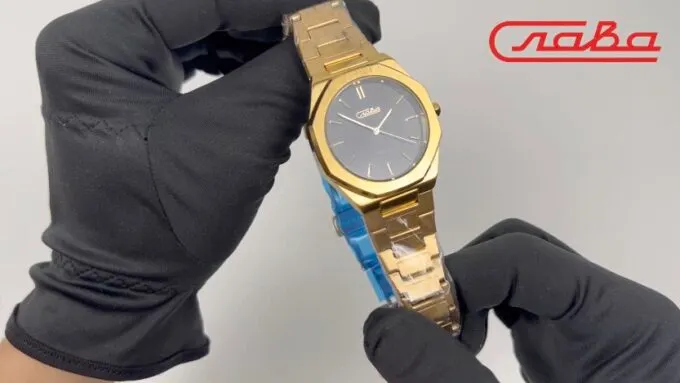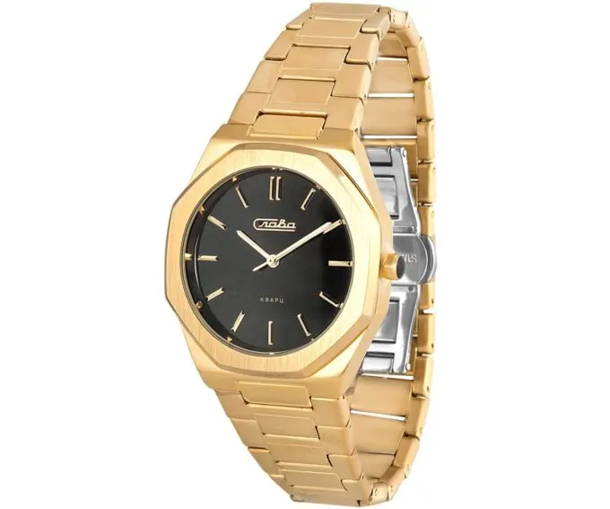 Классика от отечественного часового завода — Слава Традиция 2389483/100-2035 — выглядит максимально дорого и напоминает те самые Audemars Piguet Royal Oak. Наш лот может пофлексить восьмиугольным корпусом с золотым IP-покрытием, минеральным стеклом с сапфировым напылением и японским кварцевым механизмом Miyota 2035. Всё собрано добротно и качественно.