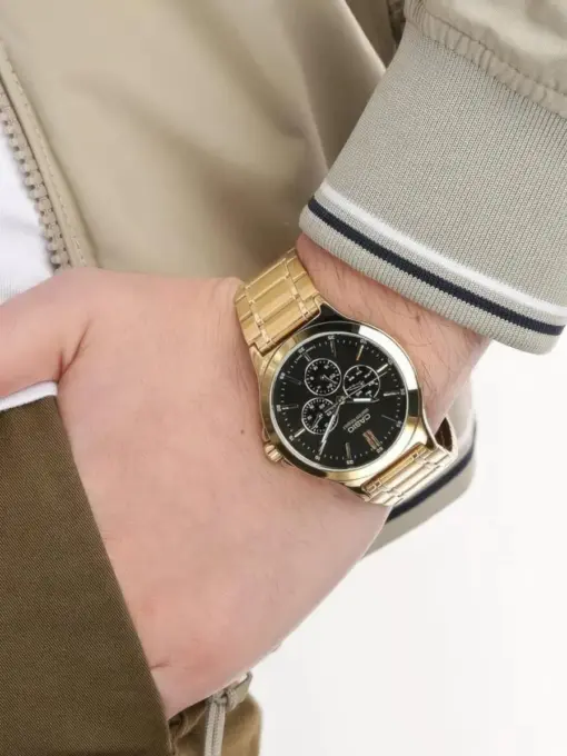 Универсальный выбор для тех, кто ищет яркий стиль, японскую точность и солидную функциональность в минималистичном формате. Контраст чёрного циферблата и золотого корпуса придаёт Casio Collection MTP-V300G-1A деловой и уверенный вид. А лаконичные римские метки красиво играют на солнце. Главное, что тут всё органично и без излишеств.