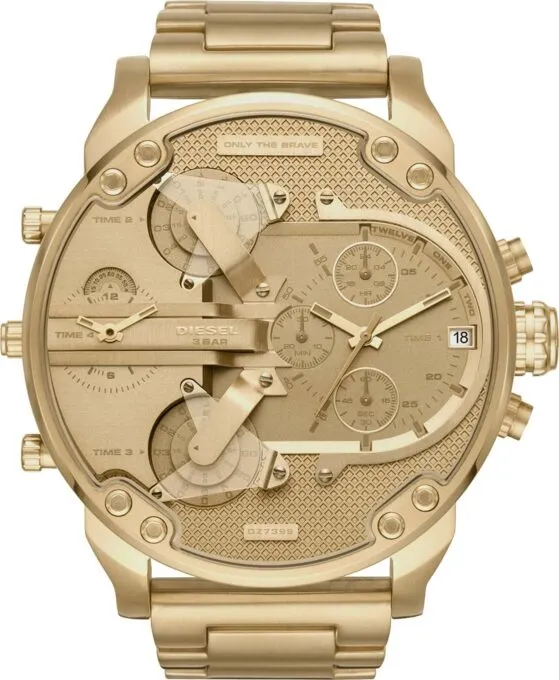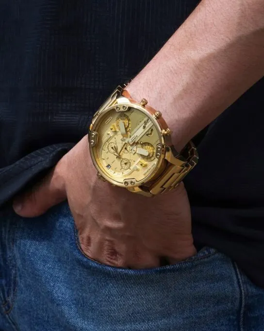 Ещё пачка плюсов Diesel Mr. Daddy 2.0 DZ7399: корпус из нержавеющей стали в золотом цвете, минеральное стекло и фирменный браслет. В совокупности они создают ощущение максимальной премиальности. Влагозащита тут базовая — 30WR. Но такие часы больше подходят для офиса и вечерних выходов, чем для отдыха у бассейна.