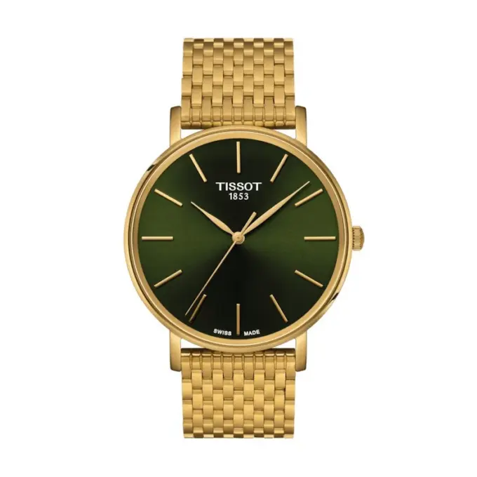 Также Tissot Everytime T143.410.33.091.00 могут похвастаться вечным швейцарским механизмом с индикацией заряда (EOL). А изумрудный циферблат в сочетании с тонкими золотыми метками выглядит эффектно и благородно. Финальный штрих — влагозащита 50WR. О контактах с водой можно не беспокоиться, но нырять с аквалангом в этих часиках не стоит.