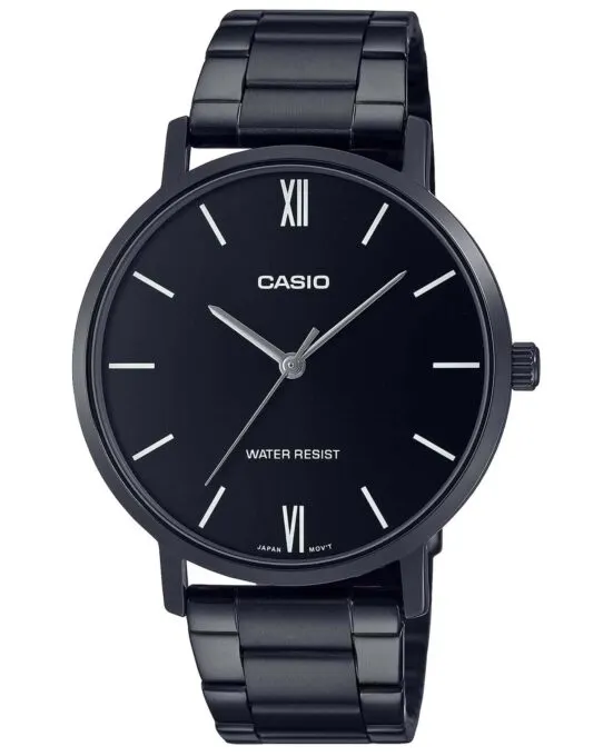Casio Collection Standard MTP-VT01B-1B — японские наручные часы с минималистичным чёрным дизайном. Они выглядят в меру сдержанно и стильно, что делает их универсальными для повседневной носки, офиса или деловых встреч. Круглый корпус из металла с IP-покрытием защищает часы от мелких царапин и потертостей, а стальной браслет с тройной раскладывающейся застёжкой обеспечивает комфорт и надёжную фиксацию.