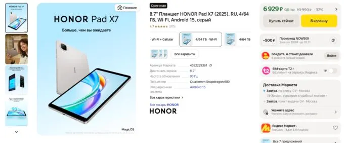 Свежая модель 2025 года — Honor Pad X7. Это компактный планшет с мощной батареей и прочным корпусом, который выдержал 42 испытания на надежность. Во всяком случае, так заявляет производитель. Дизайн тут максимально идентичен флагманским планшетам бренда. Девайс выглядит намного дороже всего прайса и весит всего 365 г.