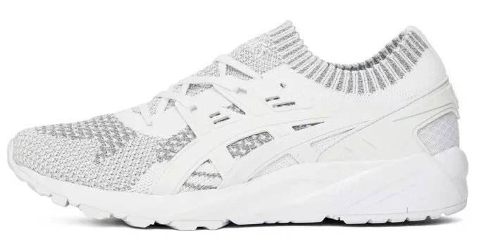 Теперь взгляните на белые Gel-Kayano Trainer Knit – для бега и фитнеса. Это переосмысление классической модели от Asics с легким тканым верхом. Тут вам и амортизирующая межподошва с технологией Gel, и вставки для стабилизации, и цепкий рисунок протектора. Ну, а дизайн просто роскошный.