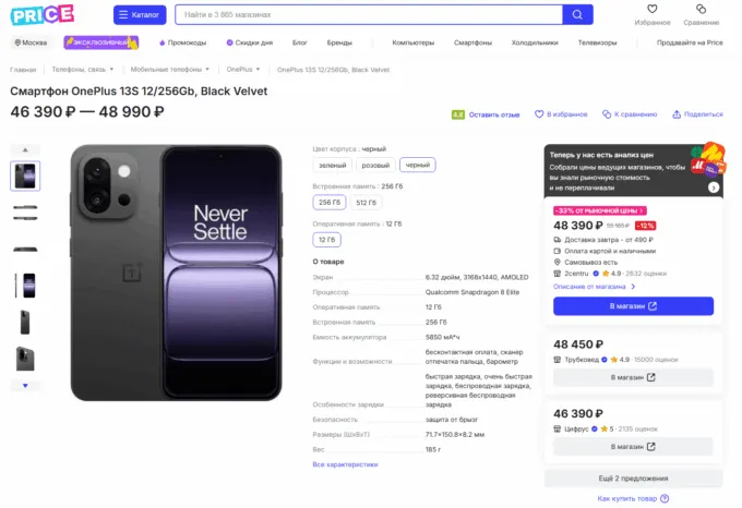 Что по цене? Сейчас OnePlus 13S сливают на price.ru всего от 46 390 рублей. Напоминаем, что ценник указан для Москвы — если вы находитесь в другом городе нужно переключиться на столицу и проверить, можно ли оформить доставку.