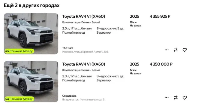 Компания из Подмосковья готова привезти RAV4 XA60 за 4 355 925 рублей, дилер из Владивостока — за 4 350 000 рублей. Машины доставляют из Китая.