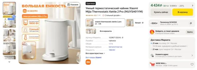 Прямо сейчас стильный чайник Xiaomi Mijia Thermostatic Kettle 2 Pro можно урвать на Яндекс Маркете всего за 4896 рублей. Также не забывайте про кэшбеки некоторых банков, которые позволят сэкономить ещё больше.