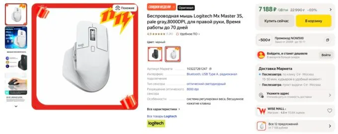 Обычно за Logitech MX Master 3S просят под 10 тысяч, но в честь распродажи на Яндекс Маркете её можно урвать всего за 7188 рублей. Также не забывайте, что многие банки готовы отсыпать кэшбек за покупку на этой платформе.