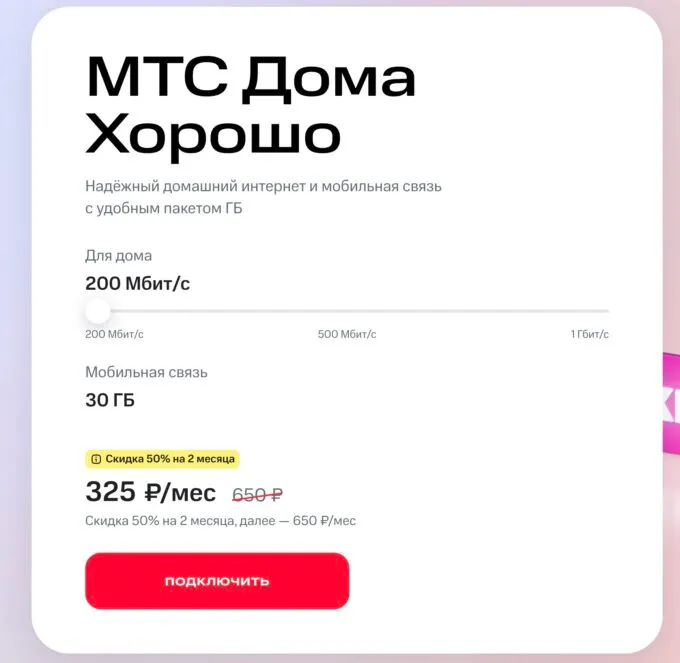 - МТС Дома Хорошо: для дома — 200 Мбит/сек, для мобильной связи — 30 Гбайт. Тариф стоит 650 рублей.