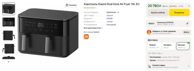 Прямо сейчас самый мощный аэрогриль Xiaomi Mijia Dual Zone Air Fryer 10L EU можно урвать на Яндекс Маркете всего за 20 780 рублей. Также не забывайте, что многие банки готовы отсыпать жирный кэшбек за покупки на этой платформе.