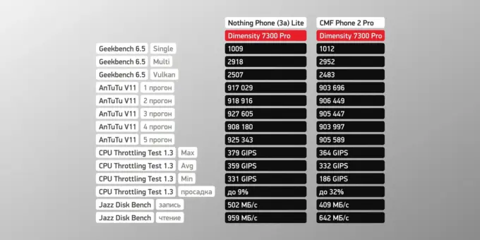 Здесь установили экран AMOLED на 6,77 дюйма с частотой 120 Гц и пиковой яркостью 3000 нит. Смартфон имеет чип MediaTek Dimensity 7300 Pro 5G и 8 Гбайт ОЗУ. Удивительно, но по тестам смартфон Nothing немного обходит девайс CMF, хотя это братья-близнецы.