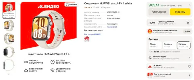 Сейчас на Яндекс Маркете хитовые часы Huawei Watch Fit 4 можно урвать за 9857 рублей. А с кэшбеком некоторых банков вы сэкономите ещё пару сотен рублей.