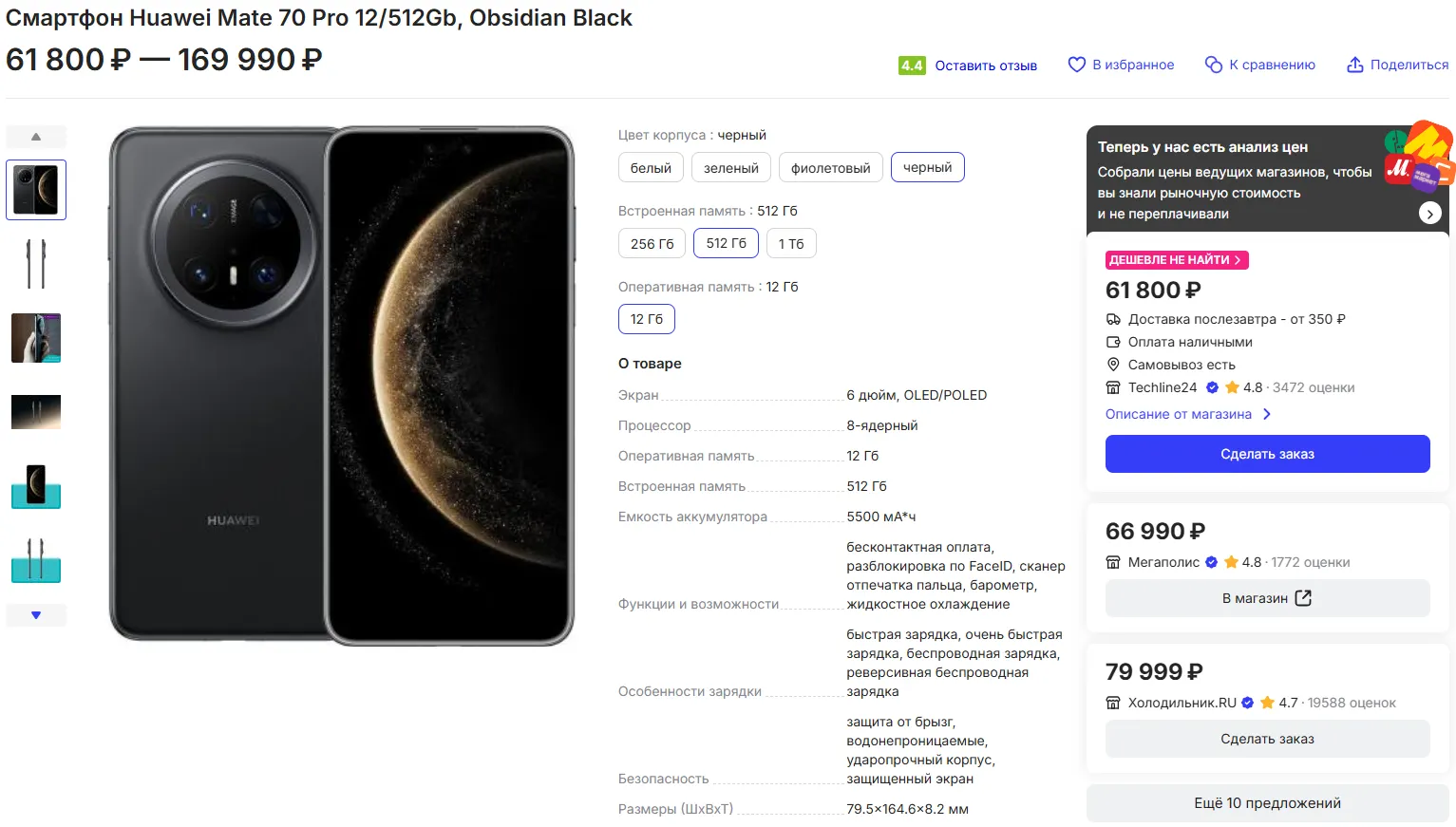 Если вам плевать на эти минусы, смело хватайте Huawei Mate 70 Pro, пока он доступен за 61 800 рублей на price.ru. Нужен флагман с достойными фотовозможностями и «гуглами» за те же деньги? Тогда присмотритесь к актуальному Honor Magic 7 Pro с трио камер на 50+200+50 Мп и 3D ToF-датчиком спереди или прошлогоднему Samsung Galaxy S24 Ultra с квадрокамерой на 200+10+50+12 Мп. Эти устройства снимают чуть хуже «мейта», зато у них все гуд с производительностью и Google-сервисами.