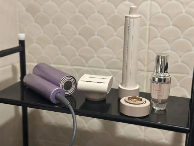 Устройство имеет три конфигурации: транспортировочную, фен (90 градусов) и стайлер (180 градусов). Аксессуары крепятся на магнитах (привет, Dyson) — это практичное решение.
