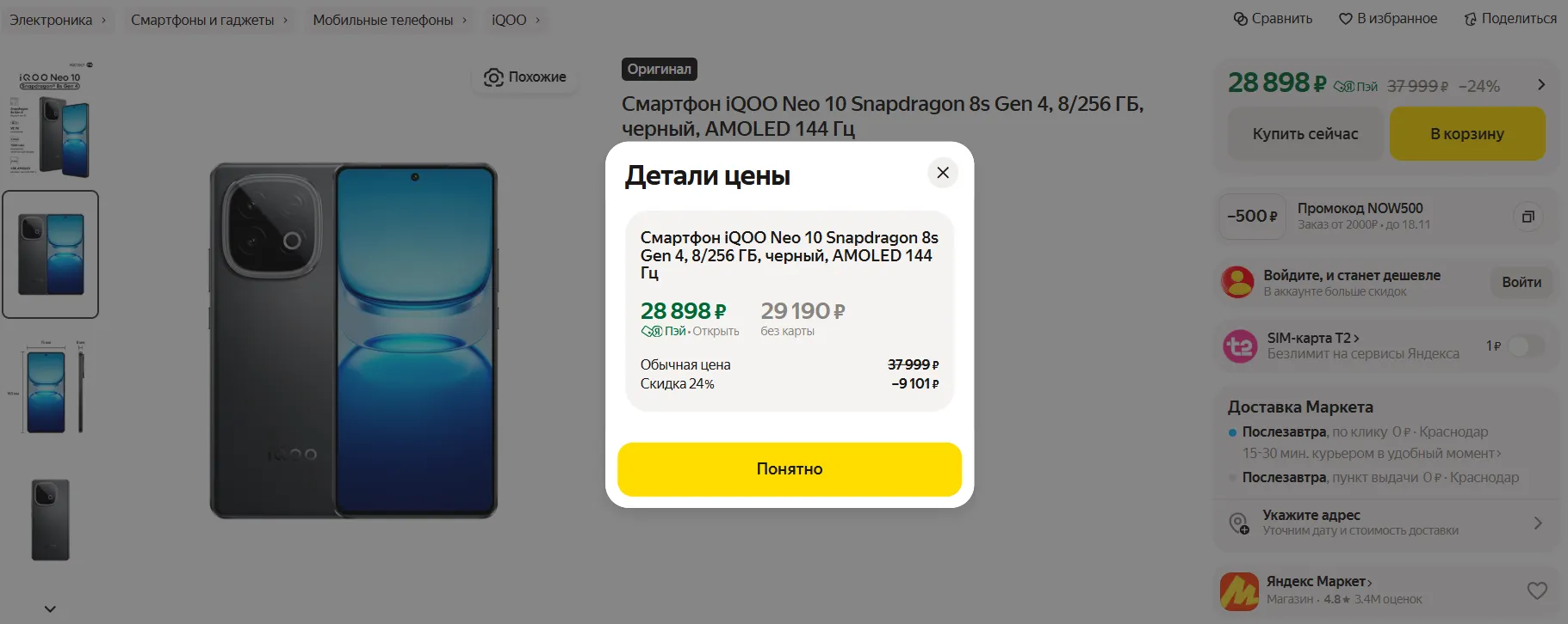 Неплохие спецификации для смартфона за тридцатку, не так ли? Однако не назовем «пятнашку» безальтернативным вариантом. Нужен более производительный девайс? Ваш выбор — iQOO Neo 10 с предфлагманским процем Snapdragon 8s Gen 4. Вообще, «десятка» уступает «реалми» лишь по фотовозможностям, к тому же у этого убийцы флагманов нет реальной влагозащиты. Остальные параметры либо на одном уровне с Realme 15, либо даже лучше.