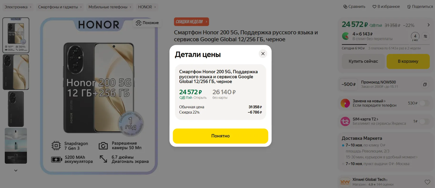 Ищете аппарат с классными камерами в пределах 30К? Обязательно присмотритесь к Honor 200, пока он еще не пропал из продажи. У этого устройства при себе трио на 50+50+12 Мп, то есть даже полноценный телевик с 2,5-кратным оптическим зумом на месте. При этом «онор» еще и дешевый — на Маркете за него просят минимум 26 140 рублей.