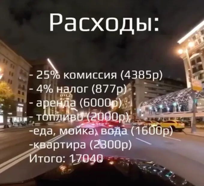 В конце автор подсчитал, что 4385 рублей ему придется отдать в качестве комиссии сервису (25%). Еще около 900 рублей уйдут на налог самозанятого, 6000 рублей — аренда авто. Также таксист добавил в расходы топливо, еду и аренду квартиры. Получилось 17 040 рублей, то есть после смены он оставил в кармане чистыми ровно 500 рублей.