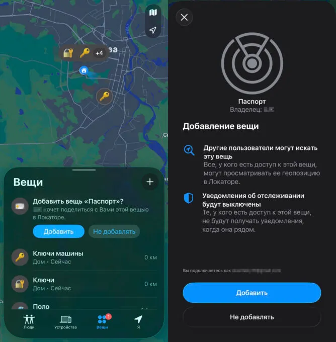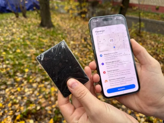 У меня нет обычного бумажника, поэтому я отдал трекер жене — устройство Ugreen смешалось с остальными карточками в ее кошельке. Также мы попробовали поделиться трекером в Локаторе — в моем приложении тоже появилась метка.