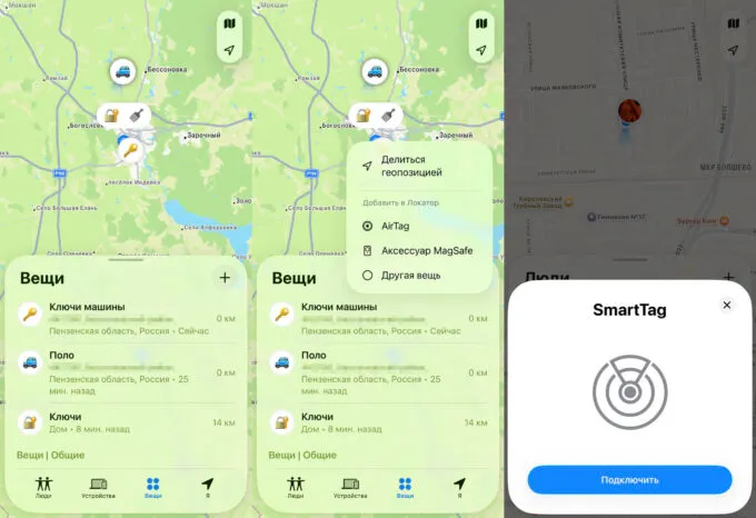 Очень просто. Открываем приложение Локатор, нажимаем на +, выбираем «Добавить в Локатор» и «Другая вещь». Затем выдергиваем пломбу из нового трекера и подносим к смартфону. Все! Устройство появится во вкладке Вещи, отсюда им можно управлять — чекать местоположение, включать звук, активировать режим пропажи.