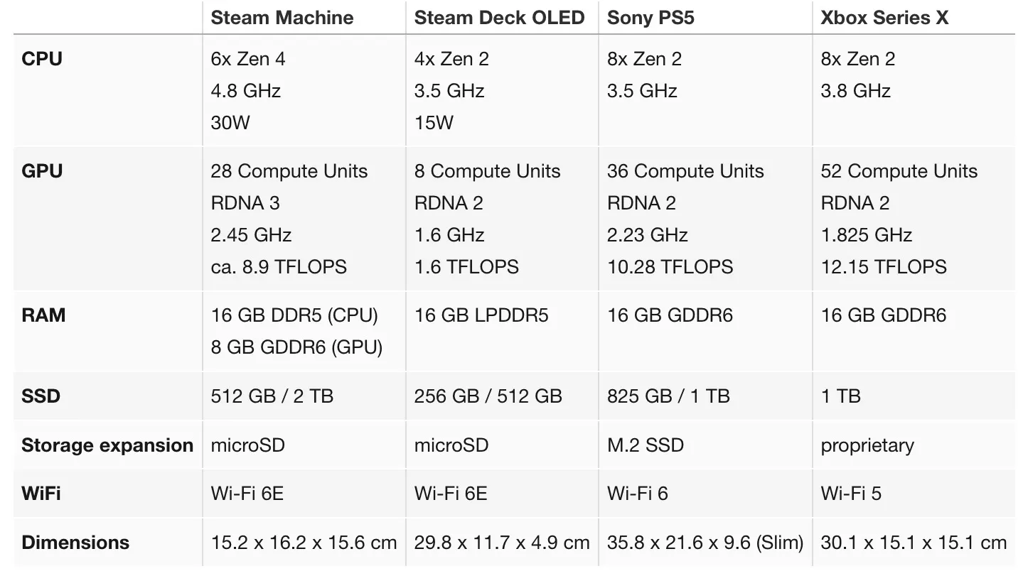 Хорошая оптимизация Steam Machine ой как пригодится. Авторы портала NotebookCheck заметили, что консоль Valve заметно уступает по производительности актуальным консолям PS5 и Xbox Series X. Так, у приставок более мощный графический процессор — примерно на 15,6% и 36,5% соответственно. А жизненный цикл консолей уже подходит к концу.