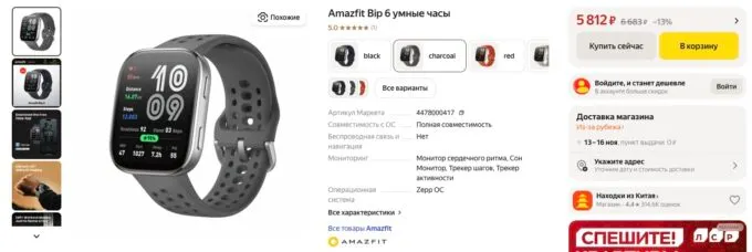 Прямо сейчас отличные часы Amazfit Bip 6 можно урвать на Яндекс Маркете всего за 5812 рублей. Также не забывайте, что многие банки готовы отсыпать кэшбек за покупки на этой платформе.