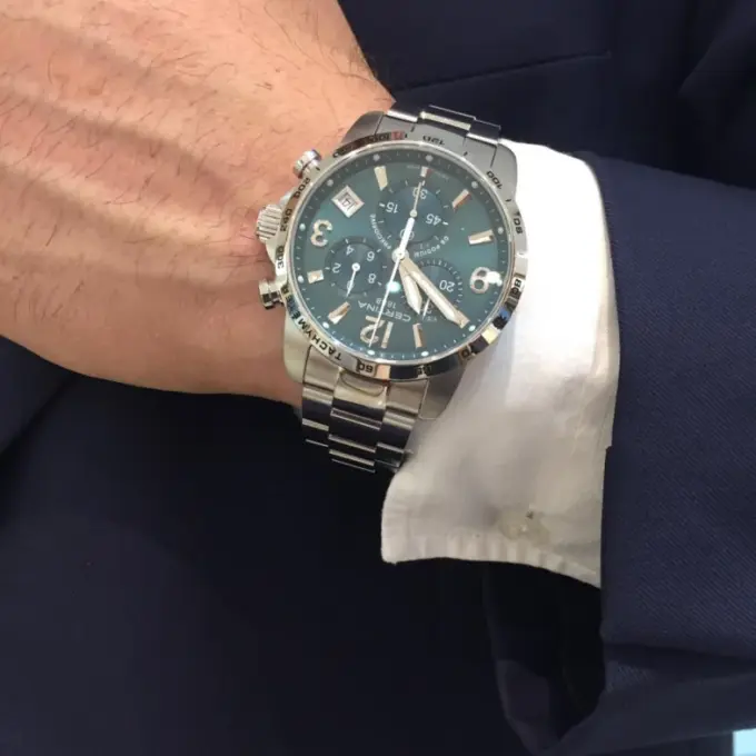 Внутри Certina DS Podium Chronograph C034.417.11.097.00 установлен механизм ETA G10.212 AA Precidrive, который отличается высокой точностью. Вдобавок хронограф фиксирует десятые доли секунды в реальном времени, на безель нанесена тахиметрическая шкала, а люминесцентные стрелки ярко светятся в темноте. Влагозащита тут очень солидная — 100WR. Этого достаточно, чтобы не переживать за часы в бассейне и на море.