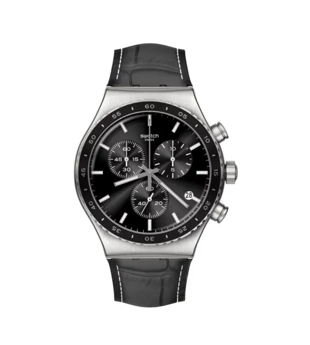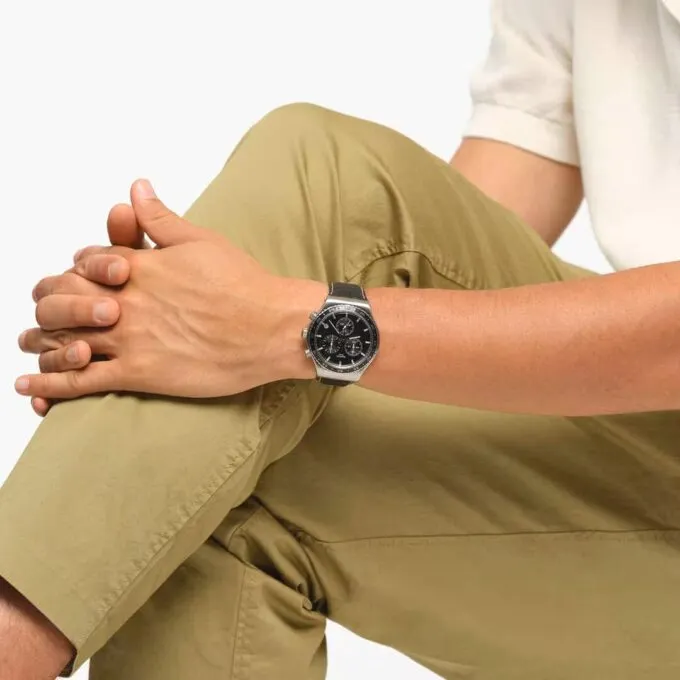 Хронограф Irony Chrono YVS495 от Swatch визуально отсылается к дорогим премиальным моделям. Всё благодаря стальному корпусу, аккуратным меткам и продуманным счётчикам. Минималистичный циферблат с окошком даты на отметке «4 часа» прикрыт акриловым стеклом, которое создаёт характерный для Swatch визуальный объём.