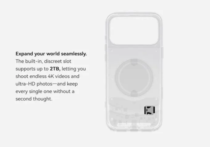 Во внутренностях чехла спрятали слот под карту памяти и проводок USB-C. При желании таким образом можно расширить память айфона, докинув до 2 Тбайт. Классно же!