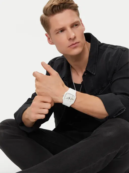 Diesel Cliffhanger 2.0 (DZ2204) — один из самых нестандартных релизов итальянского бренда за последние годы. Квадратный корпус, керамическая эстетика и футуристичный дизайн сразу отсылают к дорогим моделям Rado, но здесь всё гораздо приземлённее по цене. Особенно эффектно смотрится версия в белом цвете: часы выглядят свежо, дорого и максимально необычно. На циферблате сразу два формата времени — классические метки и 24-часовая разметка, плюс крупная цифра 9 и логотип Diesel, которые добавляют характер.