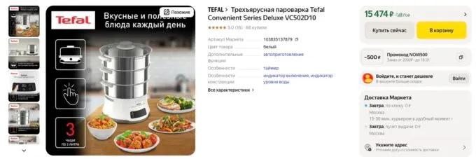 Сейчас отличную пароварку Tefal Convenient VC502D10 на Яндекс Маркете можно урвать за 15 474 рубля. А с кэшбеками некоторых банков она обойдётся ещё дешевле.