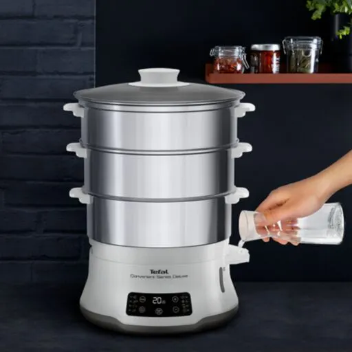 Tefal Convenient Series Deluxe VC502D10 — футуристичная трехъярусная кастрюля, которая выглядит очень аккуратно. Тут белая минималистичная база, металлические акценты и три стальных секции, которые легко снимаются и моются. Это не тот гаджет, который пытается выглядеть премиально, он больше про максимальную пользу и практичность. При этом на любой кухне он будет смотреться вполне презентабельно. Да, и места много занимать не будет.