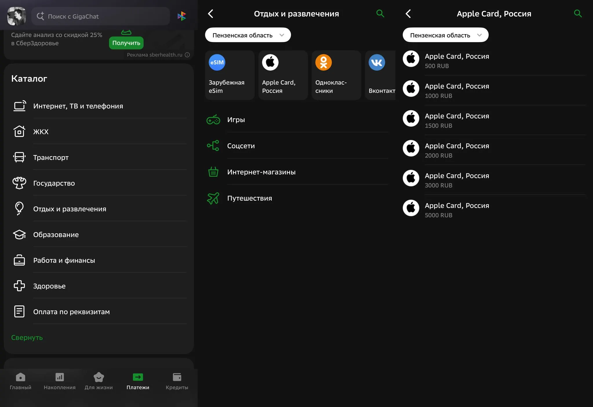 Открываем Сбербанк Онлайн — подойдет любая работающая версия программы. Затем переходим во вкладку Платежи, выбираем Отдых и развлечения. Там находим услугу Apple Card, Россия.