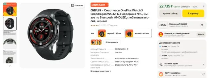 Часы OnePlus Watch 3 (46 мм) выделяются лаконичным дизайном с премиальными материалами. Корпус сделан из титана, а дисплей прикрыт сапфировым стеклом. Тут установлен яркий и четкий LTPO AMOLED-экран на 1,5 дюйма. Девайс работает на полноценной Wear OS, что дает доступ к каталогу приложений Google Play, но без розетки он выдаёт всего лишь 5 дней. Ещё тут есть точный двухчастотный GPS, куча тренировок и богатый набор функций для здоровья, включая ЭКГ и анализ сосудов.