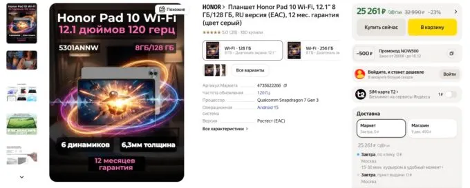 По начинке у Honor Pad 10 всё вполне солидно. Планшет оснащён 12,1-дюймовым дисплеем с разрешением 2.5K и частотой обновления 120 Гц. За производительность отвечает чип Snapdragon 7 Gen 3 с 8 ГБ оперативной и 256 ГБ встроенной памяти. Батареи на 10 100 мАч хватит на просмотр целого сезона сериала (12-13 часов). Слота для карты памяти тут нет, зато есть система из шести динамиков с объёмным звуком, Wi‑Fi 6, Bluetooth 5.3 и Android 15 с MagicOS 9.0 из коробки.