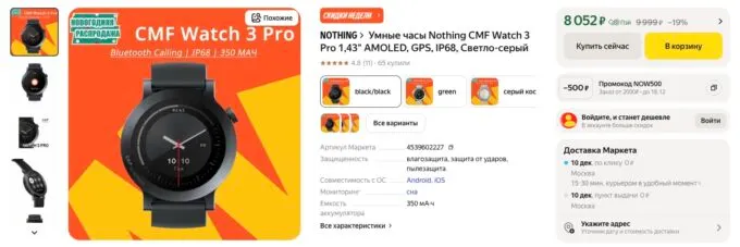 В качестве часов можно взять CMF Watch 3 Pro. Они предлагают круглый AMOLED-экран на 1,43 дюйма, базовый набор датчиков для мониторинга здоровья, отслеживание тренировок и двухдиапазонный GPS. Ещё с них можно отвечать на звонки. Изюминка модели — сменные безели. Без подзарядки они работают до 13 дней. Единственный спорный момент — влагозащита IP68, без заявленных 5 АТМ, поэтому плавать в них не рекомендуется.