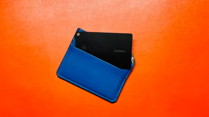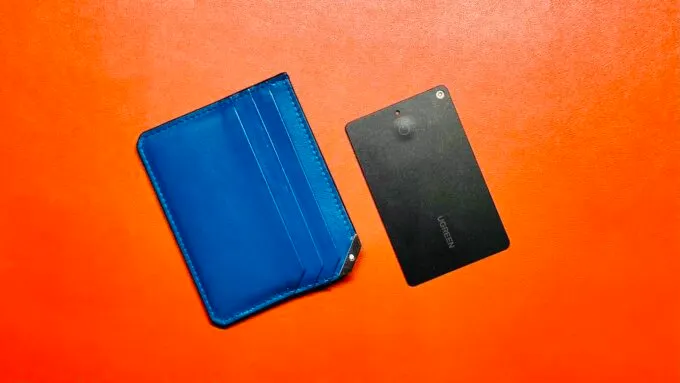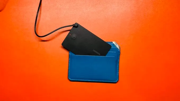 Второй девайс — Ugreen Slim Smart Finder (CM817) — трекер в карточном формате. Это метка размером с банковскую карту, которая без проблем помещается в кошелёк или картхолдер. Он не особо выпирает, не мешает и вообще не ощущается при ношении. Для кошелька это, пожалуй, одно из лучших решений на рынке. Безусловно, оно намного практичнее AirTag, который приходится как-то прятать или докупать специальный чехол.