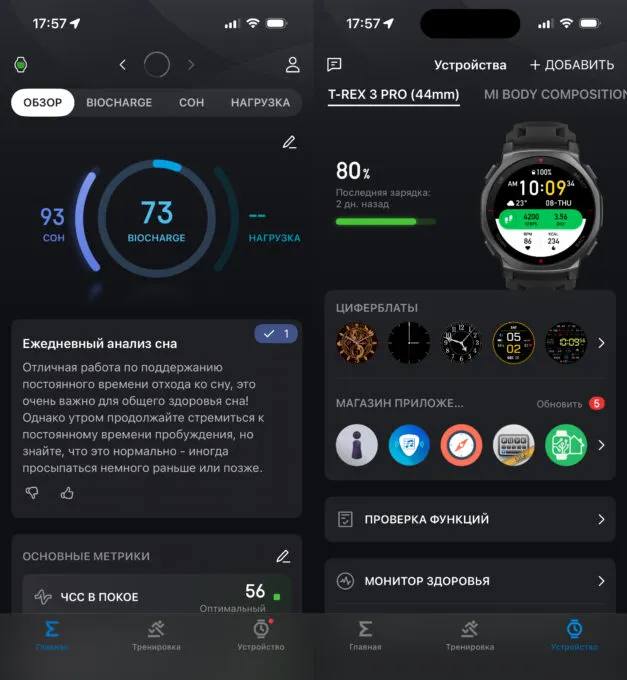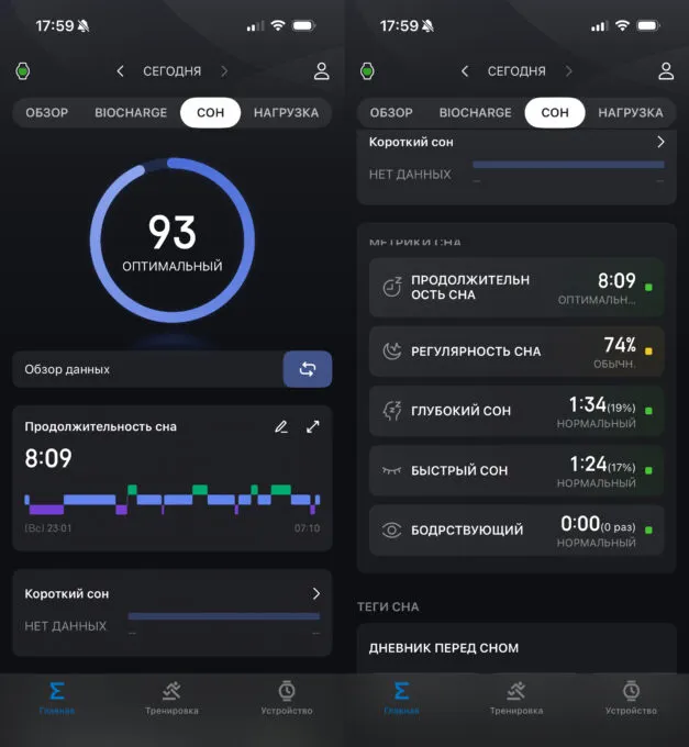 3. Трекинг сна хорош, но есть один нюанс. Саму длительность сна и фазы T-Rex 3 Pro отслеживает хорошо, но не хватает более точной фиксации пробуждений, когда посреди ночи открываешь глаза буквально на минуту и сразу засыпаешь обратно. Возможно, «прошки» просто не считают настолько короткие промежутки за полноценные пробуждения, но это не точно.
