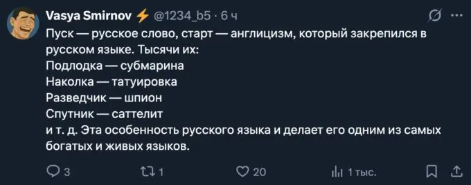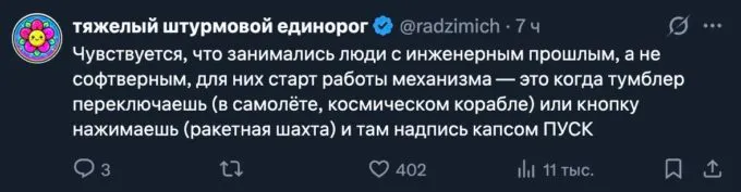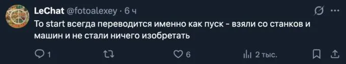 По мнению юзера @radzimich, Start перевели именно как «Пуск», а не «Старт», потому что локализацией занимались люди с инженерным образованием. «Для них старт работы механизма — это когда тумблер переключаешь (в самолете, космическом корабле) или кнопку нажимаешь (ракетная шахта), и там надпись капсом ПУСК», — уточнил автор.
