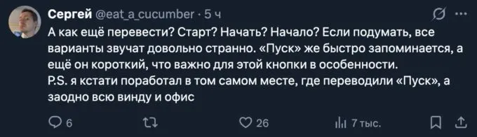 Юзер @eat_a_cucumber считает, что все альтернативные варианты перевода звучали бы странно — «Начало», «Старт» и другие. А еще локализаторов наверняка похвалили дизайнеры Microsoft: «Пуск» состоит всего из 4 слов, быстро запоминается и не портит UX-кнопки.