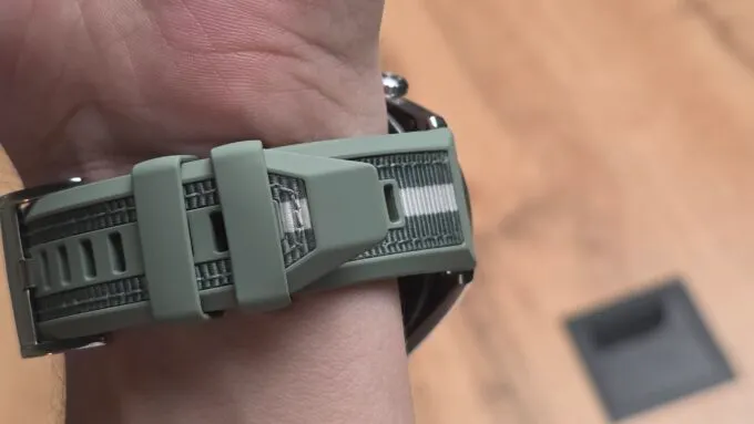 2. В моей версии салатовый тканево-силиконовый ремешок. Оригинальное решение – силикон не натирает, ткань выглядит органично, однако в душ я в них не хожу. Не люблю, когда какие-то элементы даже в теории могут разбухнуть. И не люблю, когда вода заливает экран, и там включается всё подряд. Но все же отмечу: тут водозащита 5 атмосфер и поддержка IP69. То есть часы не боятся душа и бассейна, а еще в них не попадет никакая пыль. По плаванию в море: возле берега – норм, а погружаться не стоит.