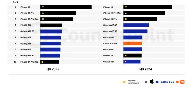 По данным авторитетного Counterpoint Research, устройства Samsung заняли с 5 по 9 места в топе самых продаваемых смартфонов за третий квартал 2025 года. И все эти устройства — серии Galaxy A.