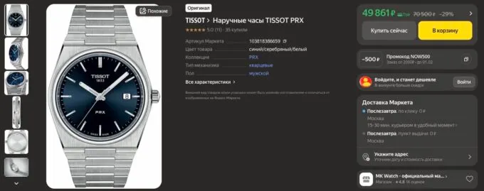 Корпус и браслет Tissot PRX T137.410.11.041.00 выполнены из стали 316L, циферблат защищён сапфировым стеклом, а за точность отвечает швейцарский кварцевый механизм ETA. На стрелки и метки нанесено фирменное люминесцентное покрытие для хорошей считываемости в любых условиях. А влагозащита в 100WR позволяет плавать в часах и спокойно заниматься почти любыми водными активностями, кроме дайвинга. Это идеальный вариант для тех, кто хочет люксовый аксессуар на запястье без пятизначного ценника.
