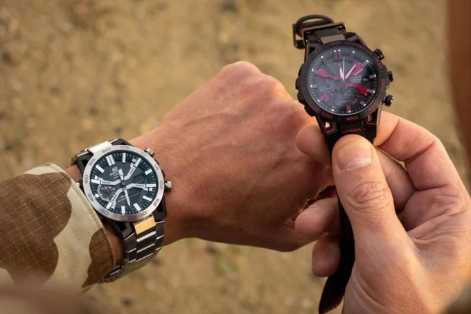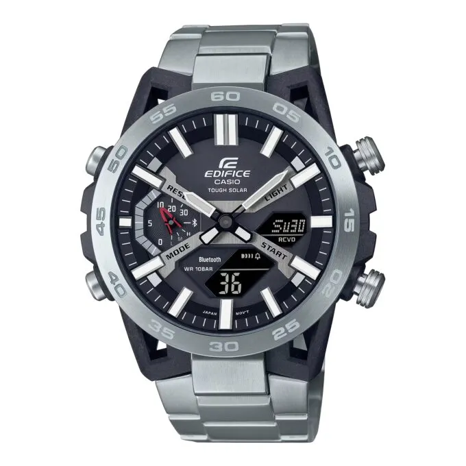 Часы Casio Edifice ECB-2000D-1A работают от солнечной панели Tough Solar, поэтому про батарейки можно забыть. Ещё они поддерживают Bluetooth-синхронизацию со смартфоном, предлагает секундомер с точностью 1/100 секунды, таймер, мировое время и двойную подсветку. Ну, а влагозащита в 100WR позволяет спокойно плавать и нырять на небольшую глубину. Это отличный выбор для всех, кто хочет технологичные часы без отказа от классического формата.
