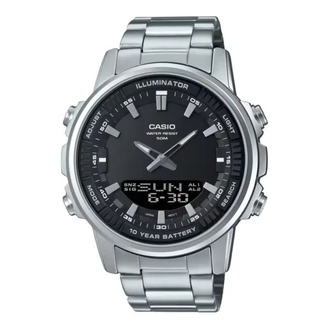 Открывает подборку практичный японский хронограф Casio Collection Illuminator AMW-880D-1A. Модель создана для тех, кто ценит функциональность и надёжность. Стальной корпус и браслет выглядят строго и универсально, а цифровой дисплей делает часы максимально удобными в повседневной эксплуатации. Плюс здесь есть подсветка с мягким оранжевым свечением, секундомер, таймер и даже встроенная телефонная книга, что большая редкость для часов в бюджетном сегменте.