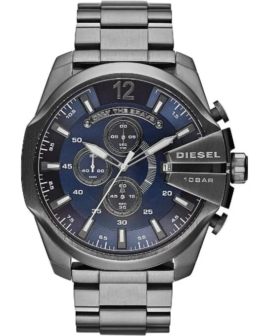 Diesel Mega Chief Chronograph DZ4329 — это максимально брутальный подход к классическим стальным часам. Крупный корпус, массивный браслет из стали 316L и насыщенный синий циферблат сразу дают понять: модель создавалась с уклоном на дерзкий характер и уверенность. Несмотря на тёмный циферблат, белые стрелки с люминесцентным покрытием обеспечивают отличную читаемость даже в темноте.
