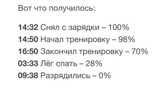 Главная проблема старых часов — батарея. С 2021 года ее емкость сократилась до 68%. Ради этого текста Павел зарядил девайс на 100% и снял его с зарядки после обеда. Весь день он занимался обычными активностями и посетил тренировку, а потом лег спать. Оказалось, что часы сели в момент, когда играл будильник утром следующего дня. Однако девайс протянул 17 часов, что всего на час меньше заявленной автономности.