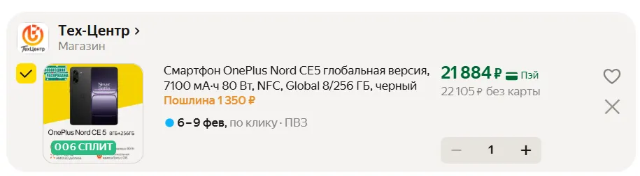 Да, у смартфона есть недостатки, но с ними можно смириться — преимуществ больше, ценник приятный. 22 105 рублей — действительно классный прайс, однако это оффер с доставкой из-за рубежа. Значит, придется подождать 2-3 недели и оплатить таможенную пошлину — примерно 1 350 рублей. Если вас это не пугает, смело хватайте OnePlus Nord CE 5, пока он не подорожал.
